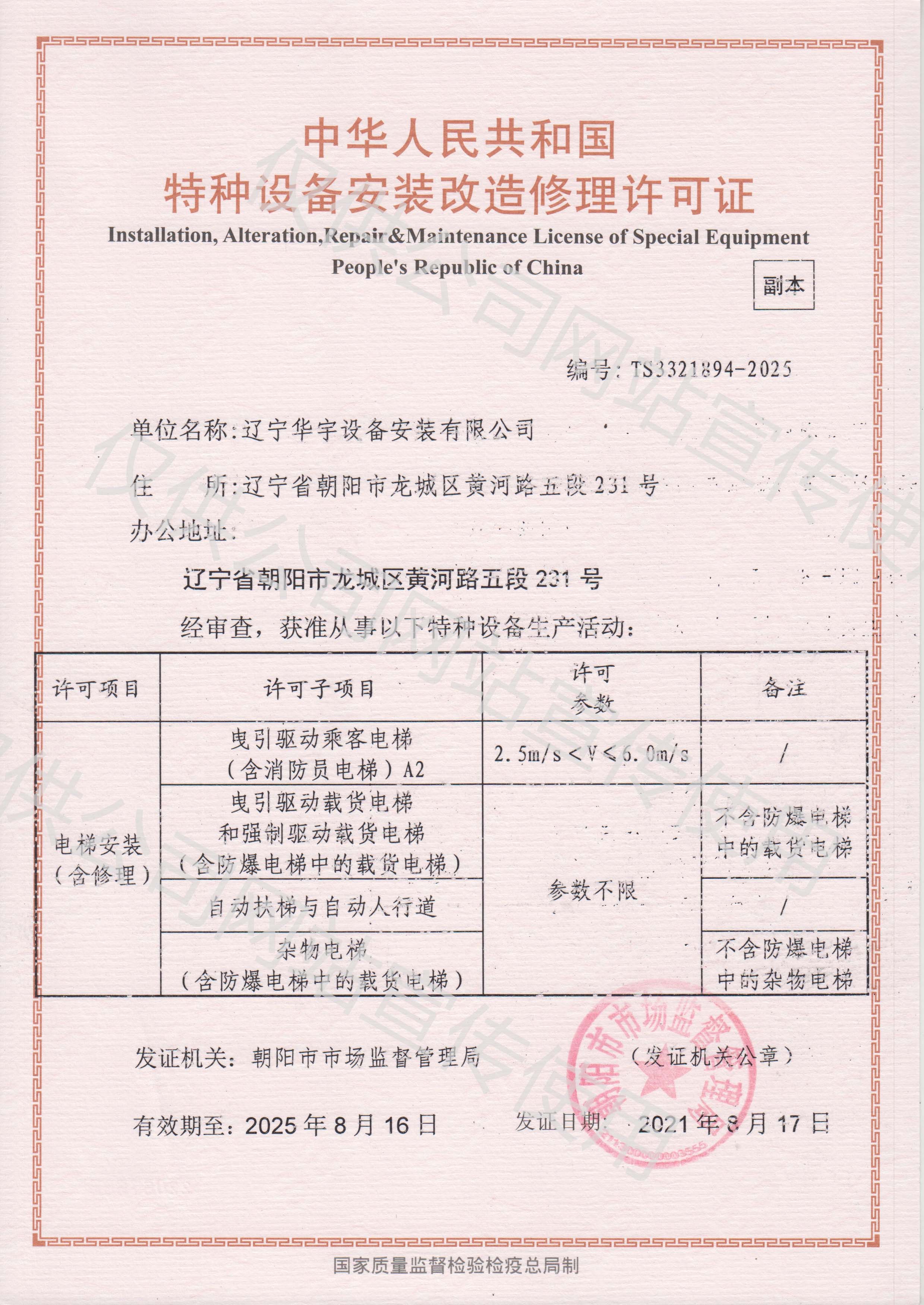 ? ? ? ?? 遼寧華宇設備安裝有限公司成立于2002年7月15日,注冊資金10000萬。公司占地面積60余畝,建筑面積4000余平。現(xiàn)取得消防設施工程專業(yè)承包一級資質、消防設施維護保養(yǎng)檢測一級資質、建筑機電安裝工程專業(yè)承包一級資質、電子與智能化專業(yè)承包二級、建筑裝修裝飾工程專業(yè)承包二級、安全技術防范設施設計施工二級資質、建筑工程施工總承包三級、電力工程施工總承包二級、輸變電工程專業(yè)承包二級資質、電力承裝、承修、承試三級資質、鋼結構工程專業(yè)承包三級資質和地基基礎工程專業(yè)承包三級。同時是人防工程通風(防化)設備生產(chǎn)安裝企業(yè),并具備電梯銷售、電梯安